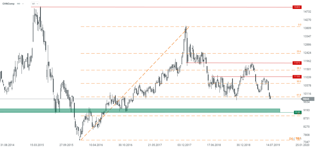Hang Seng (CHNComp) znajduje się blisko tegorocznego minimum. Przebicie się poniżej zniesienia 61,8% ostatniej dużej fali wzrostowej (2015-2017) otworzyłoby drogę do strefy wsparcia przy poziomie 9100 pkt. Źródło: xStation5