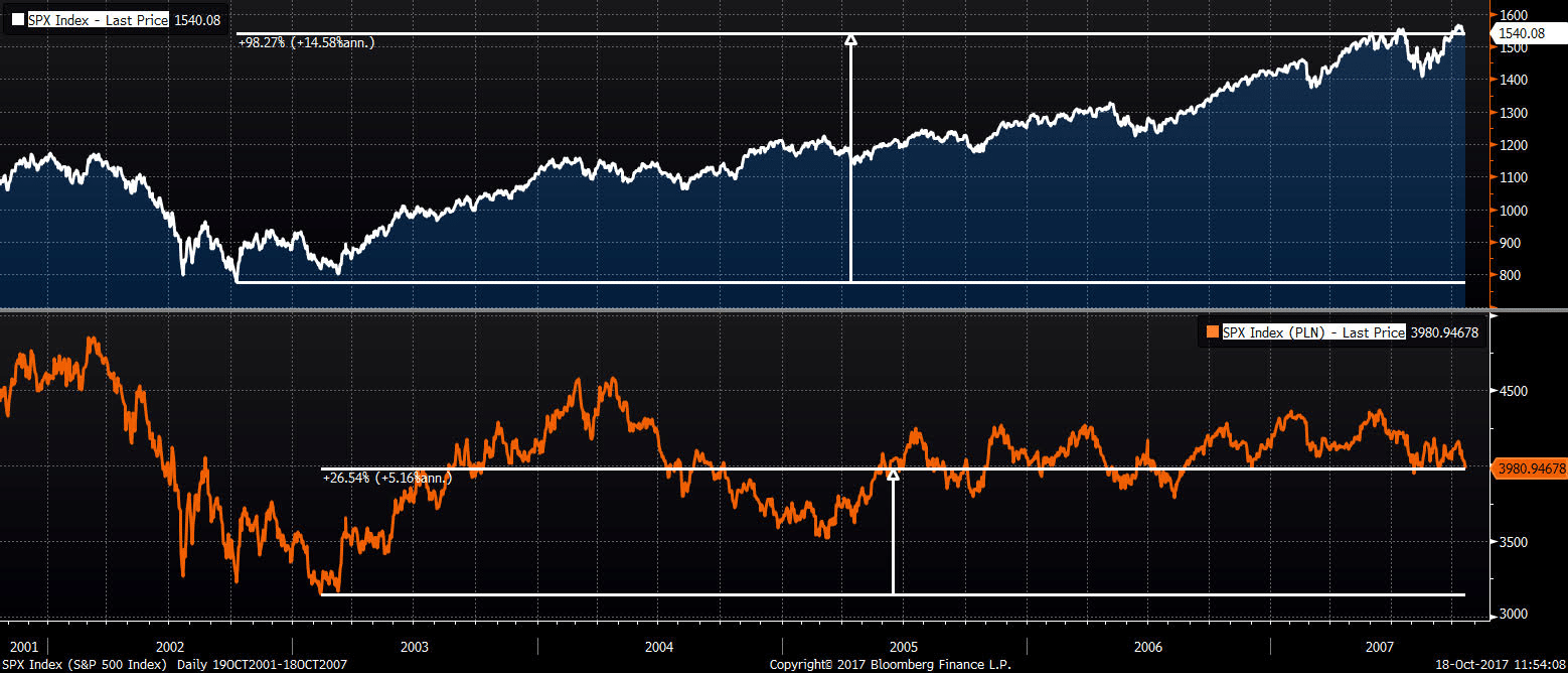 Odpowiedzią na postawione pytanie będzie powyższa grafika, gdzie przedstawiono indeks WIG 20zdenominowany w PLN (pierwsze okno) oraz w USD (drugie okno). Polski inwestor stracił 33 procent początkowego kapitału, z kolei amerykański inwestor aż 50 procent! Z czego wynika tak duża różnica?