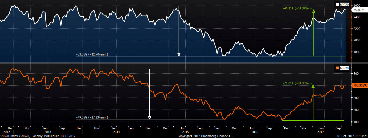 Wyobraźmy sobie amerykańskiego oraz polskiego inwestora, którzy zdecydowali się na zakup jednej jednostki indeksu WIG 20. Zainwestowali w polski indeks pod koniec 2013 roku, czyli zaraz przed mocnym tąpnięciem na polskim parkiecie. Który z nich osiągną gorszą stopę zwrotu? Zakładając, że wyszli pod koniec roku 2015. Amerykański inwestor nie zabezpieczył się przed ryzykiem walutowym.