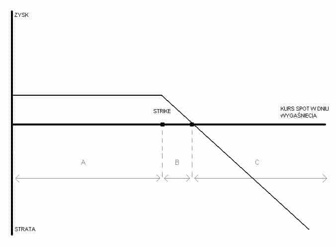 - Pole A – opcja jest realizowana, a strata wystawcy jest większa, tym niższy kurs spot w dniu wygaśnięcia opcji.
