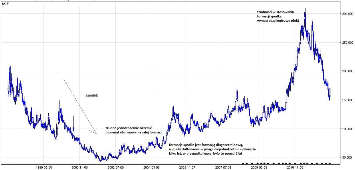 Formacja spodka jest jedną z najbardziej dochodowych formacji na giełdzie, ponieważ wzrost cen po wybiciu ceny jest często bardzo wysoki. Podczas tworzenia się tej formacji, kształt wykresu cenowego jest podobny do kształtu spodka. Wolumen obrotów zachowuje się podobnie do ceny (również jest w kształcie spodka), ale jego wahania nieco wyprzedzają ruch cenowy (obroty zaczyna wzrastać lub spadać trochę wcześniej niż kurs/cena). Jeśli ceny gwałtownie wzrosną podczas formowania spodka, wolumen musi również gwałtownie wzrosnąć (zobacz punkt A). Sygnał kupna pojawia się po wybiciu powyżej górnej granicy formacji – poziom ten jest określany przez lewą część spodka rozwiniętego przy najwyższym obrocie. Wybicie z formacji spodka musi być potwierdzone przez silny wzrost wolumenu handlu. Po wybiciu często następuje ruch korekcyjny w dół (zielony), po którym zwyżka jest kontynuowana. Na wykresach spółek o małej kapitalizacji i niskiej cenie akcji, czasami rozwijają się seryjne spodki (jeden po drugim, każdy na trochę wyższym poziomie). Wtedy to każdy z nich ma długość około 5-7 tygodni.