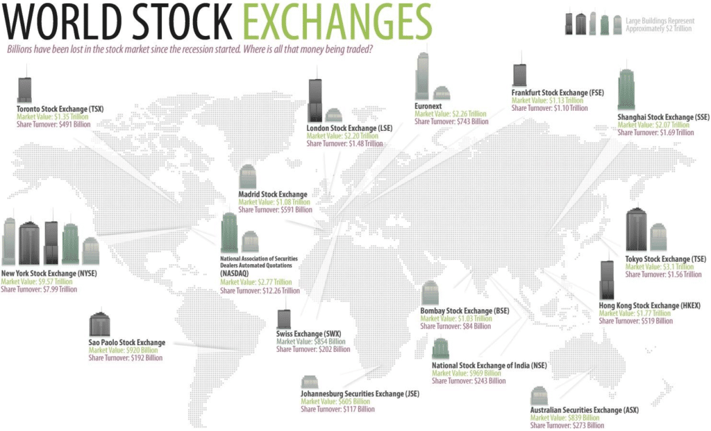 Te 16 giełd widocznych na poniższym zdjęciu stanowi około 87% całkowitej kapitalizacji giełdy, które są na świecie.