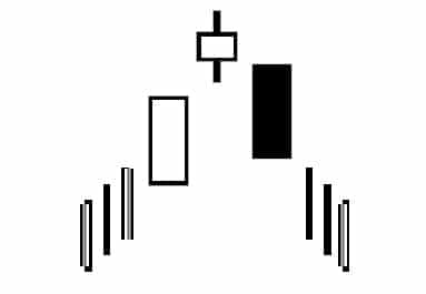 Gwiazda Wieczorna – Formacja odwrócenia trendu wzrostowego składająca się z trzech świec. Trend wzrostowy kontynuowany jest przez długa białą świecę. Kolejna świeca otwiera się luką w górę, więc wydaje się potwierdzać trend wzrostowy. Cena zaczyna się wahać, zmniejsza się impet i świeca zamyka się małym korpusem w dowolnym kolorze. W tym momencie następuje odwrócenie trendu. Kolejna świeca otwiera się luką w dół, by zamknąć się w okolicach dolnej połowy świecy pierwszej. Potwierdzeniem formacji są transakcje poniżej korpusu trzeciej świecy.