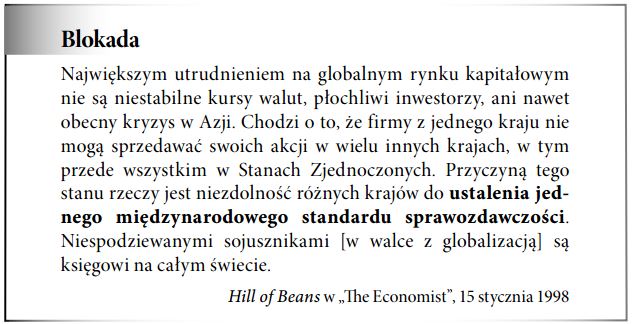 Harmonizacja wymaga osiągnięcia zbieżności na wielu płaszczyznach. W kwestii standardów istnieje istotny rozdźwięk między anglosaską tradycją księgową, kładącą nacisk przede wszystkim na interesy inwestorów, a standardami bardziej ukierunkowanymi na zaspokojenie potrzeb organów podatkowych i wierzycieli/kredytodawców. Największą z przeszkód do pokonania jest być może rozbieżność między standardami międzynarodowymi, a amerykańskimi ogólnie przyjętymi zasadami rachunkowości, które – biorąc pod uwagę wielkość i dynamikę amerykańskiego rynku kapitałowego – są ogólnie uwa- żane za najlepsze. Ponieważ na amerykańskim rynku papierów wartościowych notowanych jest bardzo wiele spółek z całego świata (na ręce amerykańskiej Komisji Papierów Wartościowych i Giełd składa sprawozdania ponad 1000 spółek z ponad 50 krajów), znalezienie możliwego do przyjęcia kompromisu z amerykańskimi standardami rachunkowości stanowi największe wyzwanie.