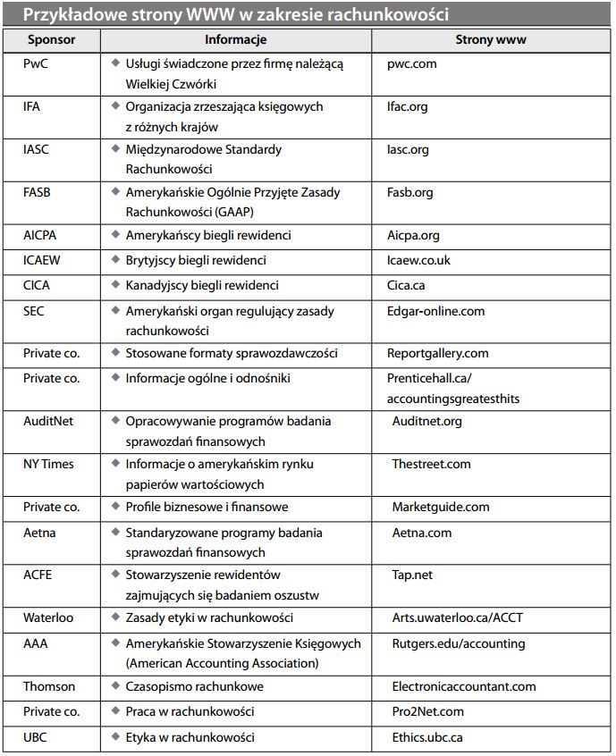 Korzystanie z sieci WWW/internetu w rachunkowości i badaniu sprawozdań finansowych. Ponieważ praca biegłych rewidentów wiąże się między innymi z gromadzeniem informacji, internet oferuje im znaczącą możliwość zwiększenia efektywności i wydajno- ści pracy. Oto przykładowe strony WWW, które mogą okazać się użyteczne: