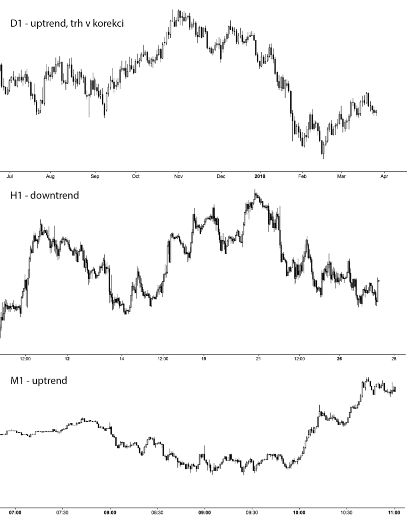 Możesz analizować rynek na dowolnym interwale czasowym. W krótszych ramach czasowych, price action i wskaźniki techniczne są znacznie mniej efektywne. Pinbar, inside bar i inne wzory na wykresie minutowym nie będą miały takiego samego znaczenia jak na wykresach H4, D1 i wyższych. Na swojej platformie handlowej możesz wyświetlić konkretny rynek, np. EURUSD, w kilku różnych przedziałach czasowych. Możesz zatem analizować rynek z perspektywy dziennej, godzinowej lub nawet pięciominutowej. Kiedy robisz to po raz pierwszy, prawdopodobnie będziesz zaskoczony i zdezorientowany.