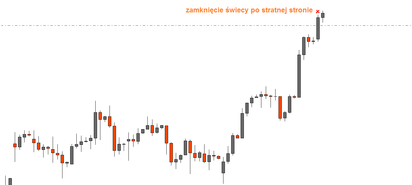 • Stop loss po zamknięciu świecy/sesji jest rzadko używany i polega na tym, że zamykamy transakcję dopiero wtedy, kiedy któraś z kolejnych świec lub cała sesja, zamknie nas po niewłaściwej stronie rynku. Jest to sygnał, że cena nie poszła od razu po naszej myśli i prawdopodobieństwo zakończenia transakcji z sukcesem maleje znacząco. Zaletą takiego rozwiązania będzie to, że często znacząco ograniczymy nasze straty. Wadą z kolei będą wszystkie te sytuacje, kiedy akcja cenowa zdołałaby się jeszcze odwrócić na naszą korzyść mimo chwilowego postoju po ciemnej stronie naszej pozycji. Inna negatywna strona takiego rozwiązania, to nasza psychika, która wielokrotnie utrudni decyzję o zamknięciu pozycji. Również brak prądu, awaria internetu, czy nasza nieobecność przy terminalu handlowym uniemożliwi zamknięcie takiej transakcji manualnie. Dlatego też zalecamy używać równolegle oddalonego nieco automatycznego zlecenia stop-loss, które w razie niemożności manualnej ingerencji w pozycję ochroni nasz kapitał przed niespodziewanym ruchem rynku.
