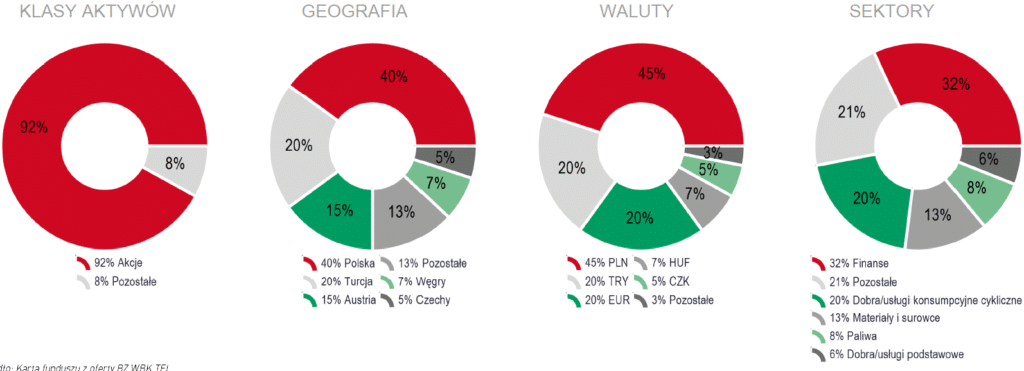 Dokument zwykle zawiera także opis polityki inwestycyjnej, który określa, w jakie klasy aktywów inwestowane są zgromadzone fundusze (np. Akcje i obligacje), czy kapitał jest inwestowany bezpośrednio czy pośrednio (np. W inne fundusze, w tym ETF) i na jakie rynki i do jakiego stopnia dane rozwiązanie może być zaangażowane. Oprócz cech syntetycznych materiały często zawierają wykresy pokazujące obecny przydział – w podziale na różne dokumenty, kierunki geograficzne i waluty itp. Część TFI zawiera również listę największych pozycji w portfelu.