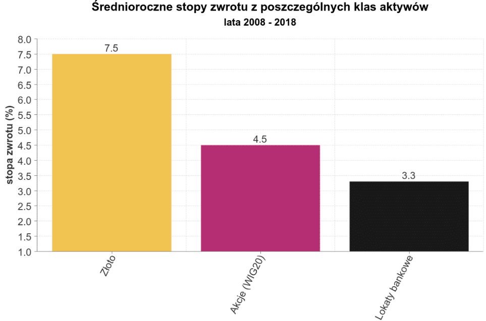 Pomimo tych negatywnych, krótkoterminowych trendów, złoto wygląda imponująco w dłuższej perspektywie. Kto je kupił, na przykład dwadzieścia lat temu, dziś ma ponad 4 razy więcej pieniędzy, a średnia roczna stopa zwrotu w jego przypadku wynosiła aż 7,5%. Dla porównania – na giełdzie (nazywamy to indeksem WIG20) jednocześnie można było zarobić średnio tylko 4,5% rocznie, aw przypadku depozytów zysk nie przekroczyłby 3,5%. Istnieją również przesłanki, że ta przewaga złota będzie kontynuowana w przyszłości. Wystarczy jedno poważne spowolnienie, a jego cena może nawet spaść o kilkadziesiąt procent w ciągu roku.