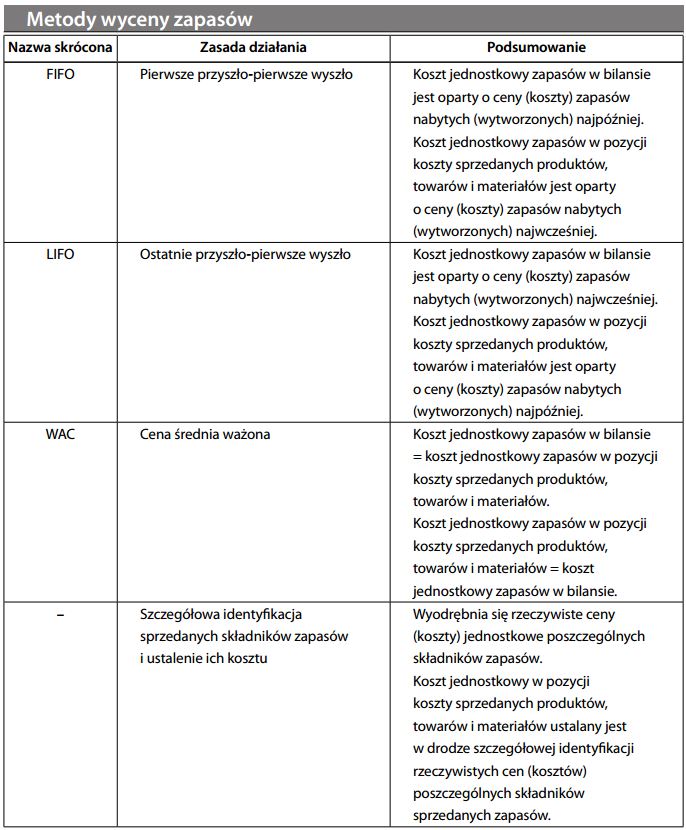 Różne sposoby rozliczania kosztów zapasów w kolejnych fazach cyklu operacyjnego. Istnieją cztery zasadnicze metody wyceny, wśród których występują także różne warianty: