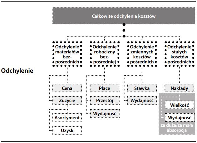 Różnica pomiędzy wielkościami założonymi w budżecie według nakładów po kosztach ewidencyjnych (skorygowanymi dla odzwierciedlenia rzeczywistych poziomów produkcji) a rzeczywistymi wynikami. Warto podkreślić, że odchylenie kosztów nie jest różnicą pomiędzy wartościami założonymi w pierwotnym budżecie, a faktycznymi wynikami. Odchylenia kosztów należy zawsze ustalać po uwzględnieniu róż- nicy pomiędzy pierwotnie planowanym, a faktycznie zrealizowanym poziomem produkcji. W ten sposób można wyodrębnić różnice zużycia zasobów na jednostkę produkcji i ustalić koszt jednostki produkcji. Całkowite odchylenie kosztów można rozbić na elementy składowe wynikające z nakładów materiałowych, robocizny, zmiennych kosztów pośrednich i stałych kosztów pośrednich. Nakłady materiałowe można dalej rozbić na kolejne elementy (jak zużycie, cena itd.). To właśnie na poziomie tych elementów składowych można podjąć działania zaradcze. Choć nikt nie spodziewa się po budżecie, że będzie wypełniony co do joty, stosunkowo duże odchylenia sygnalizują, że albo zdarzyło się coś nieprzewidzianego, albo że dane użyte do sporządzenia budżetu były nieprawidłowe. Odchylenia mogą być też spowodowane błędem losowym, gdyż rzadko zdarza się, by budżet był w całości dokładny. Identyfikacja i analiza odchyleń jest jednym z podstawowych zadań rachunkowości zarządczej, bazującym w tym przypadku na stosowaniu zasady wyjątków.
