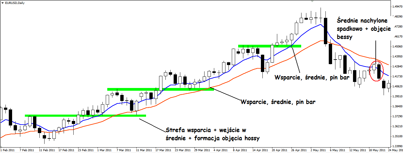 Pierwsze zagranie miało miejsce, gdy średnie były ułożone wzrostowo, a cena dokonując korekty znalazł się w ich wnętrzu. W takiej sytuacji Nial Fuller szuka innych czynników potwierdzających sygnał. Widać, że w tym miejscu mamy także strefę wsparcia, którą wyznacza poprzedni, pokonany już szczyt. Dodatkowo te dwie świece tworzą formację objęcia hossy, zapowiadająca dalsze wzrosty. Wszystko odbywa się zgodnie z panującym trendem, który wyznaczają nasze średnie. Jak widać, takie klarowne sygnały pojawiały się jeszcze kilka razy pozwalając za każdym razem zainkasować kilkudniowy zysk.