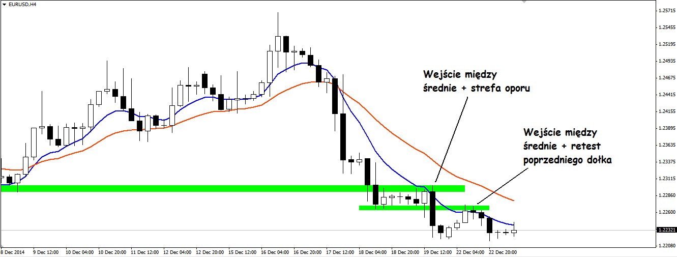 W obu przypadkach była to konfluencja strefy oporu i wejścia ceny w obszar między średnie.