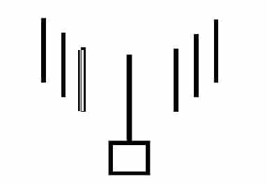Odwrócony młot jest formacją odwrócenia i może prognozować zmianę trendu. Formacja występuje w trendzie spadkowym (im większy spadek, tym większe prawdopodobieństwo odwrócenia). Po dużym ruchu w dół następuje wyprzedanie i kurs zawraca w górę. Ma miejsce spora walka podaży z popytemi, cena potrafi wybić się w górę bardzo gwałtownie, by powrócić w pobliże poprzedniego poziomu. Tak tworzy się długi cień górny. Często się zdarza, że świeca tworząca tę formację otwiera się luką. 1. krótki korpus, biały lub czarny w zależności od tego, czy kurs zamknięcia był powyżej czy poniżej kursu otwarcia 2. długi górny cień, przyjmuje się, że jest co najmniej dwukrotnie dłuższy od korpusu 3. dopuszczalny jest niewielki cień dolny (cena minimalna jest w pobliżu ceny otwarcia albo zamknięcia) Potwierdzeniem formacji są transakcje z ceną powyżej korpusu młota.