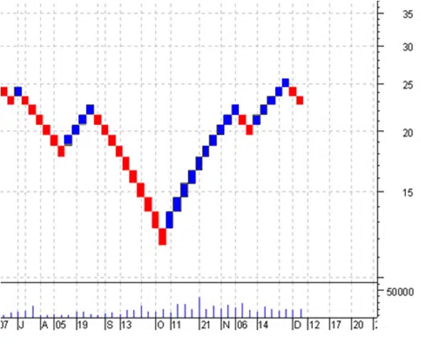 Wykres pokazuje silny trend wzrostowy w magazynie o wielkości pudełka 2 USD. Pola są losowane na podstawie cen zamknięcia, więc wzloty i upadki, a także ruchy mniejsze niż 2 USD, są ignorowane. Występuje krótkie wycofanie, oznaczone czerwonym polem, ale potem zielone pola pojawiają się ponownie. Biorąc pod uwagę silny trend wzrostowy, można to wykorzystać jako okazję do wejścia na długi okres . Rozważ wyjście, gdy pojawi się kolejne czerwone (dolne) pole.