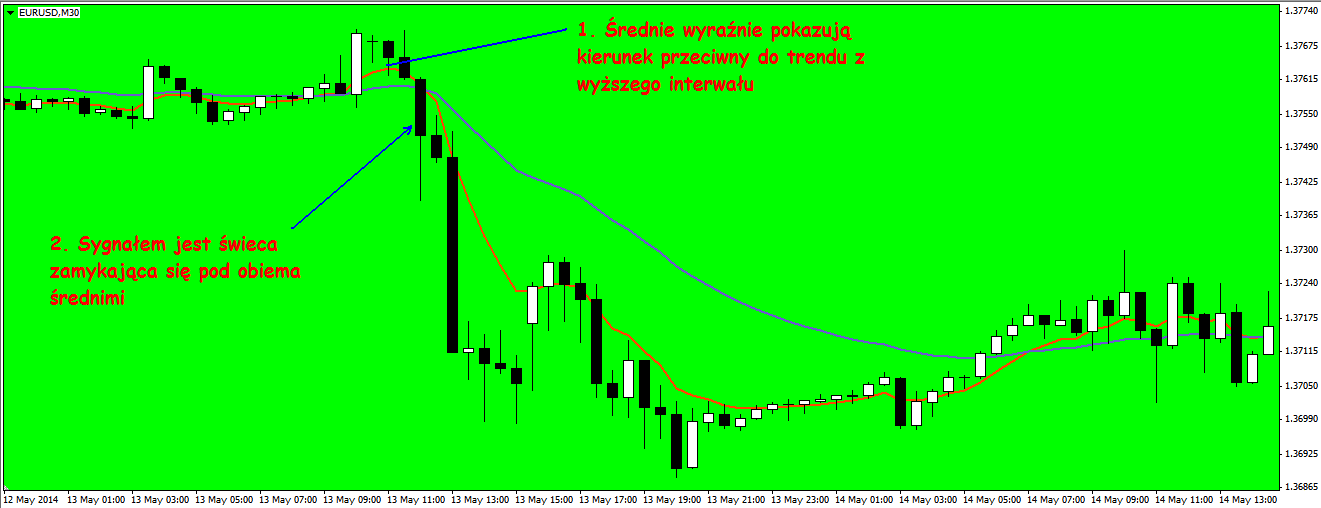 Czekamy na momenty, gdy średnie ułożą się przeciwnie do głównego trendu z wyższego interwału. Sygnał pojawia się, gdy w takim ułożeniu średnich świeca zamknie się poniżej obu średnich. Najczęściej po takim zdarzeniu średnie odwracają się w kierunku głównego trendu, co jest dla nas potwierdzeniem, że zaczynają się spadki.
