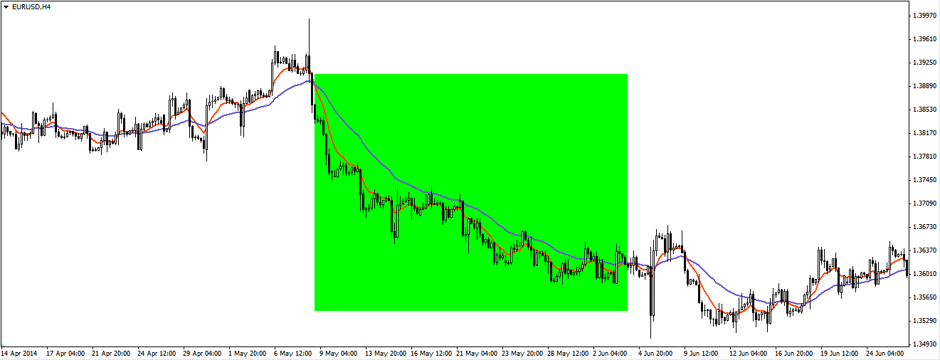 Na powyższym wykresie EUR/USD na interwale H4 zastosowałem dwie średnie ruchome: EMA 8 i EMA 30. Zielonym kolorem zaznaczyłem obszar, w którym średnie pokazywały trend spadkowy. Szukamy takich obszarów, a zaczynają się one od chwili, gdy średnie zaczną się wyraźnie oddalać od siebie. Mając już taki obszar, schodzi się na 1 lub 2 interwały czasowe niżej.