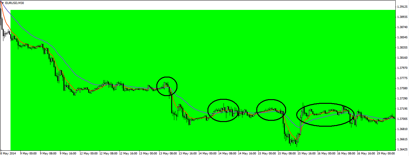 Powyżej ten sam obszar, ale na interwale M30. Gramy w kierunku ważniejszego trendu jaki panuje na wyższym 4 godzinowym interwale. Pamiętamy, że był on spadkowy. Na M30 szukamy odwrotnej sytuacji czyli miejsca, gdzie szybsza czerwona średnia znajduje się nad wolniejszą niebieską. Takie miejsca zaznaczyłem czarnymi okręgami.