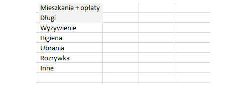 Niestety, należy stworzyć więcej kategorii wydatków, około 5-10. Pierwszy budżet powinien być jak najbardziej ogólny i intuicyjny. W kategorii mieszkanie + opłaty można uwzględnić wynajem, wodę, prąd, gaz, internet, telewizor, telefon, itp. W długiej kategorii wpisz wszelkie raty kredytów, pożyczek i innych długów, które musisz spłacać co miesiąc. Jak zauważyłeś, te 2 kategorie są wyróżnione, ponieważ są to stosunkowo stałe kwoty i można łatwo przewidzieć ich wysokość.