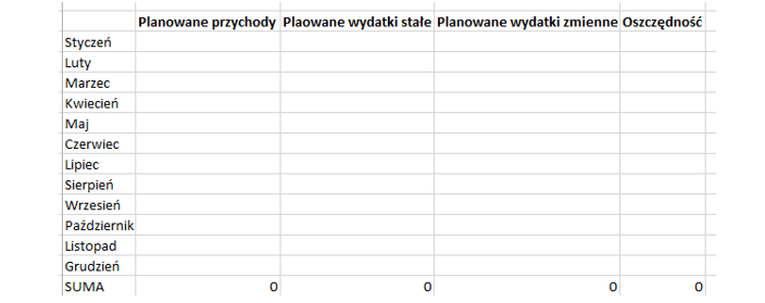 W ostatniej zakładce utwórz prosty szablon, który pozwoli Ci zaplanować przychody, wydatki i oszczędności na najbliższe miesiące. W kategorii przychodów możesz wpisać średnie przychody z poprzednich miesięcy, podobnie jak w kategorii wydatków zmiennych. Możesz dokładniej przewidzieć powtarzające się wydatki, więc wypełnienie tej sekcji nie powinno powodować żadnych problemów. W ostatniej kolumnie możesz zapisać planowane oszczędności, czyli kwotę przychodów pomniejszoną o wydatki. Ułatwi to planowanie większych wydatków, zaoszczędzenie na wyjazd wakacyjny lub po prostu uzyskanie większej kontroli nad własnymi finansami.