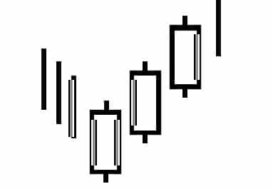 Trzech Białych Żołnierzy – Silna formacja odwrócenia trendu spadkowego, składająca się z trzech świec. W trendzie pojawiają się kolejno trzy długie białe świece. Każda kolejna otwiera się poniżej zamknięcia poprzedniej, ale ich zamknięcia są coraz wyżej i ustanawiają nowe maksima. Potwierdzeniem formacji są transakcje powyżej trzeciej świecy.
