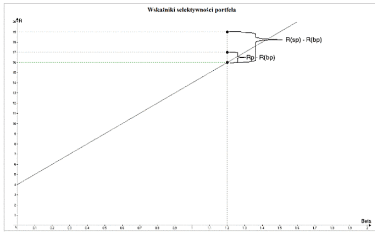 Wskaźnik selektywności mierzy premię, jaką zarządzający portfelem uzyskał poprzez indywidualny (nie benchmarkowy) dobór spółek. Wyobraźmy sobie sytuację, kiedy zarządzający uznaje, że kilka spółek jest wycenianych zbyt tanio (leżą powyżej linii SML). Decyduje się on wtedy świadomie na zwiększenie ryzyka specyficznego portfela poprzez przeważenie w portfelu takich spółek (zwiększenie udziału w portfelu powyżej ich udziału w rynku). Aby ocenić, jak to dodatkowe ryzyko przełożyło się na wynik, możemy obliczyć wskaźniki selektywności portfela.