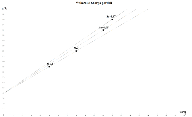 Dzięki wskaźnikowi Sharpa, posiadając parametry dochodu i ryzyka kilku portfeli, inwestor może w bardzo szybki sposób uszeregować je według kryterium efektywności. Wartość wskaźnika odpowiada premii za ryzyko, jaką inwestor otrzymuje za jednostkę ryzyka. Im wyższa jest ta premia (większy kąt nachylenia), tym lepszy jest dany portfel.