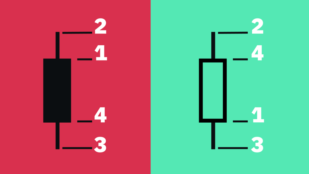 Poszczególne kolory świec i ustawienia wykresów mogą się różnić w zależności od zastosowanych narzędzi wykresowych. Domyślnie, jeśli świeca jest zielona, oznacza to, że cena została zamknięta wyższa niż otwarta. Kolor czerwony oznacza, że w czasie mierzonym przez świecę cena spadła, a więc zamknięcie było niższe niż otwarcie.