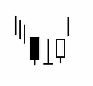 Wzrostowy Nagrobek Doji – Formacja odwrócenia trendu spadkowego. W silnym trendzie wyrysowuje się długa czarna świeca, po której następuje świeca doji z długim cieniem górnym i korpusem zbliżonym poziomem do zamknięcia świecy pierwszej. Cena otwarcia jest na tym samym poziomie co cena zamknięcia lub jest do niej bardzo zbliżona. To powoduje, że korpus ma kształt poziomej kreski. W trakcie tworzenia świecy cena porusza się w górę, lecz powraca do poziomu startowego. Tak powstaje długi cień górny. Sygnał jest istotny w silnym trendzie. Potwierdzeniem jest być długa biała świeca.
