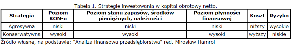 Strategia gospodarowania tymże kapitałem zależy od charakteru działalności firmy oraz przyjętej polityki finansowania. Może być agresywna lub konserwatywna. Oczywiście można optymalizować poziom KON-u, czego efektem będzie umiarkowana strategia, czyli pośrednia miedzy dwoma skrajnymi.